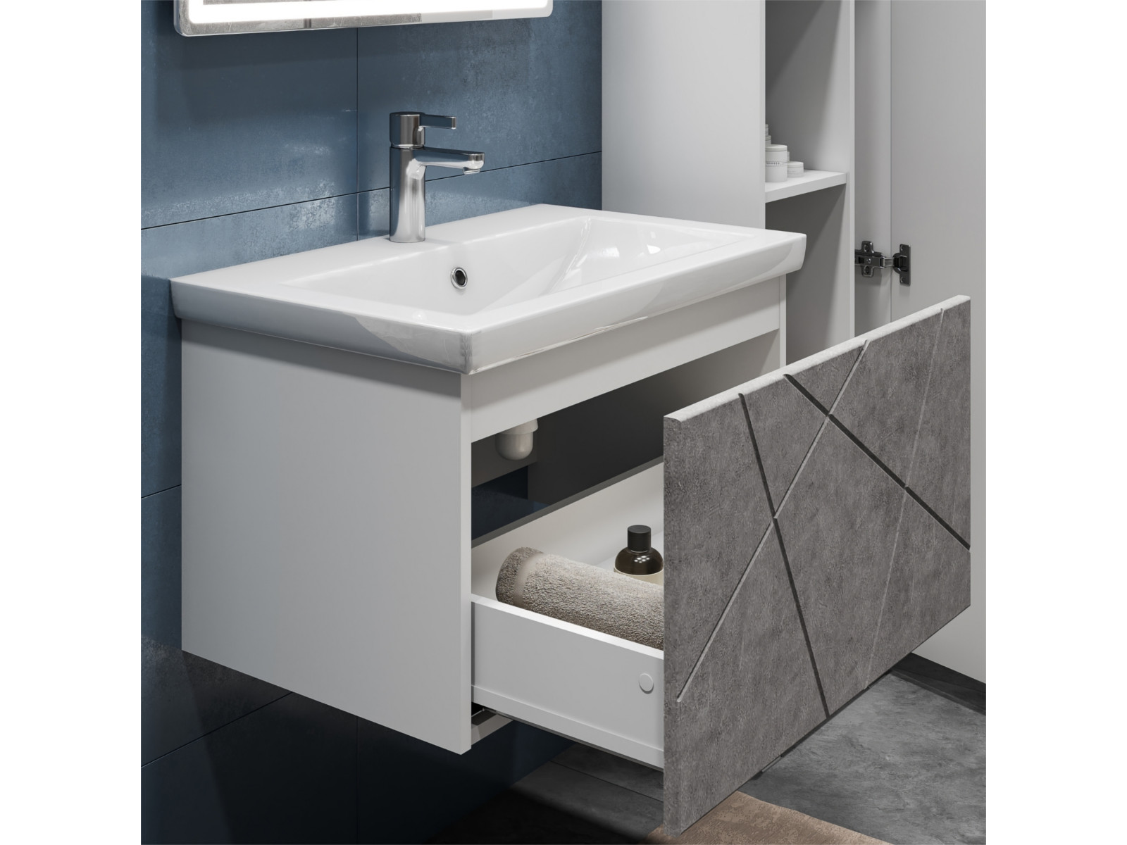 Оснащение: 1 выдвижной ящик, направляющие скрытого монтажа, открывание нажатием "push-to-open", 2 навеса, 1 сифон