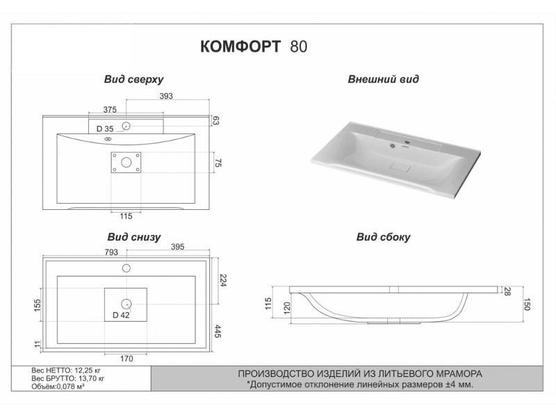 Тумба Рица 80 подвесная 1 ящик, ниша раковина Комфорт 80 cерый/керамика