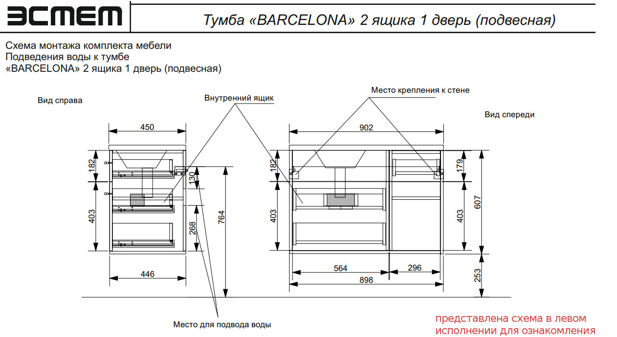Тумба с раковиной Barcelona 900 правосторонний подвесной 2 ящика 1 дверь