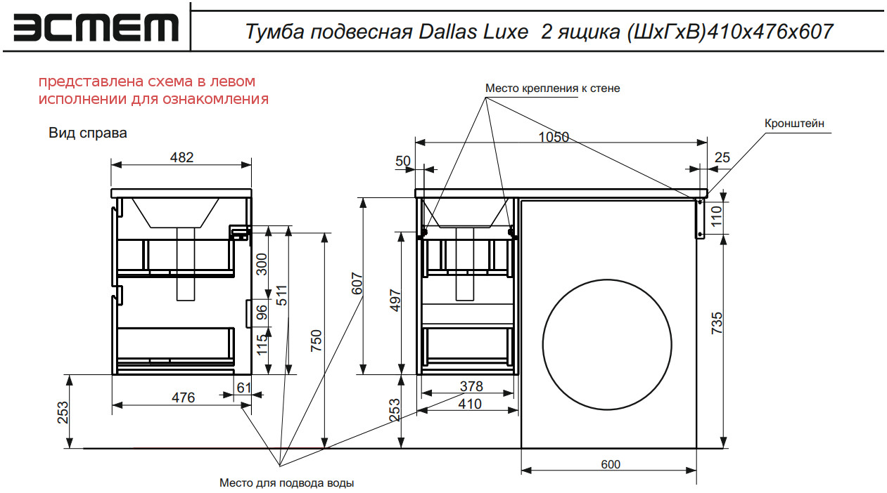 - Тумба с раковиной Dallas Luxe 1050 навесная 2 ящика правая
