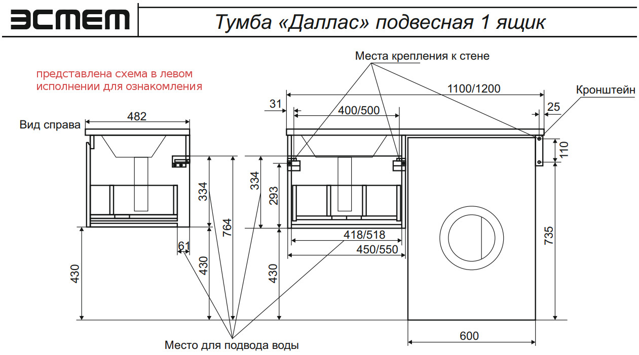 - Тумба с раковиной Dallas Luxe 1150 навесная 1 ящик правая