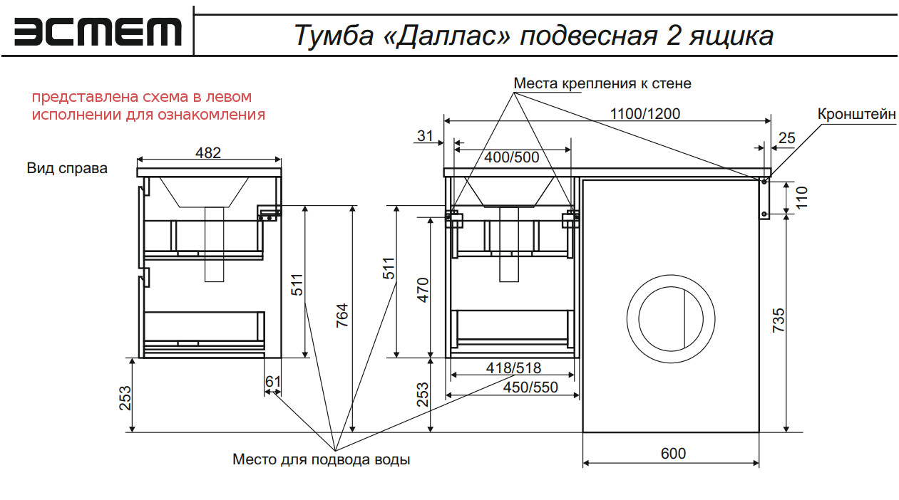 - Тумба с раковиной Dallas Luxe 1150 навесная 2 ящика правая