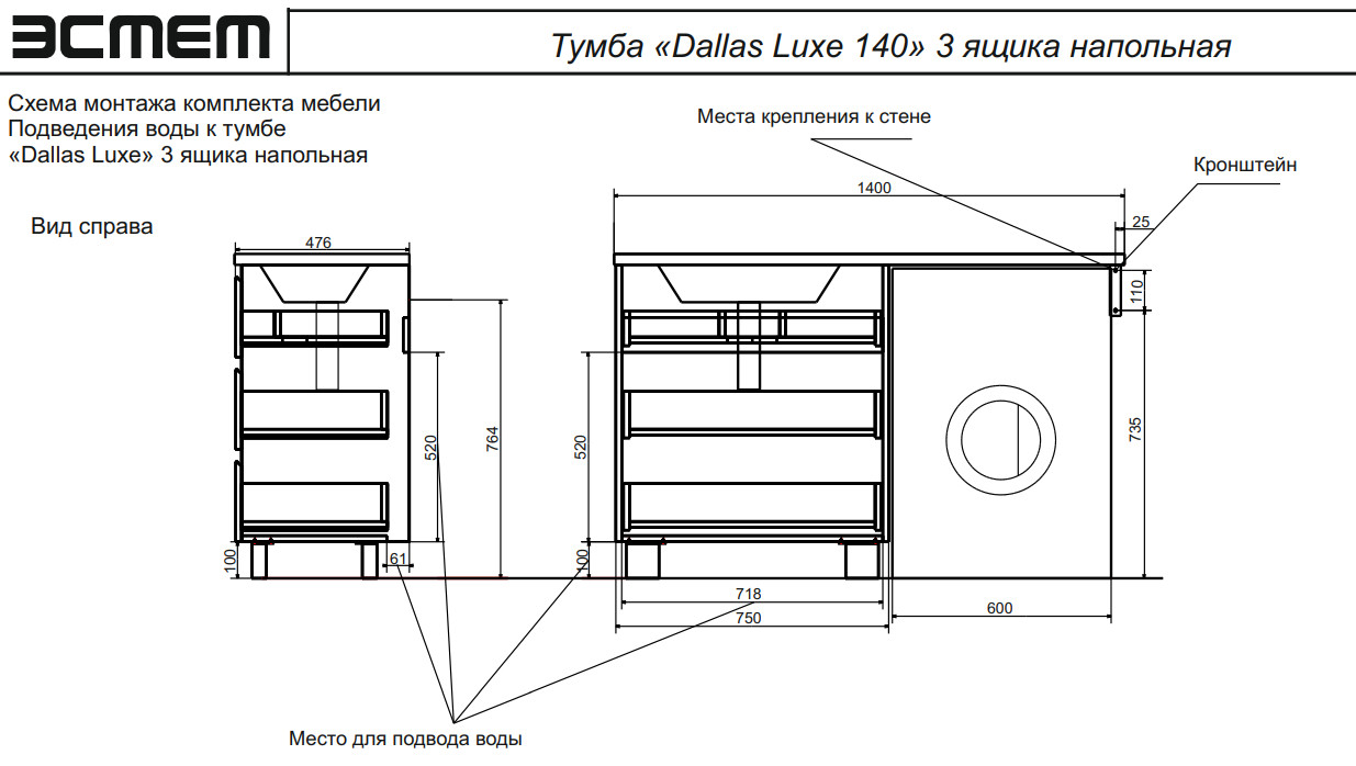 - Тумба с раковиной Dallas Luxe 1400 напольная 3 ящика левая