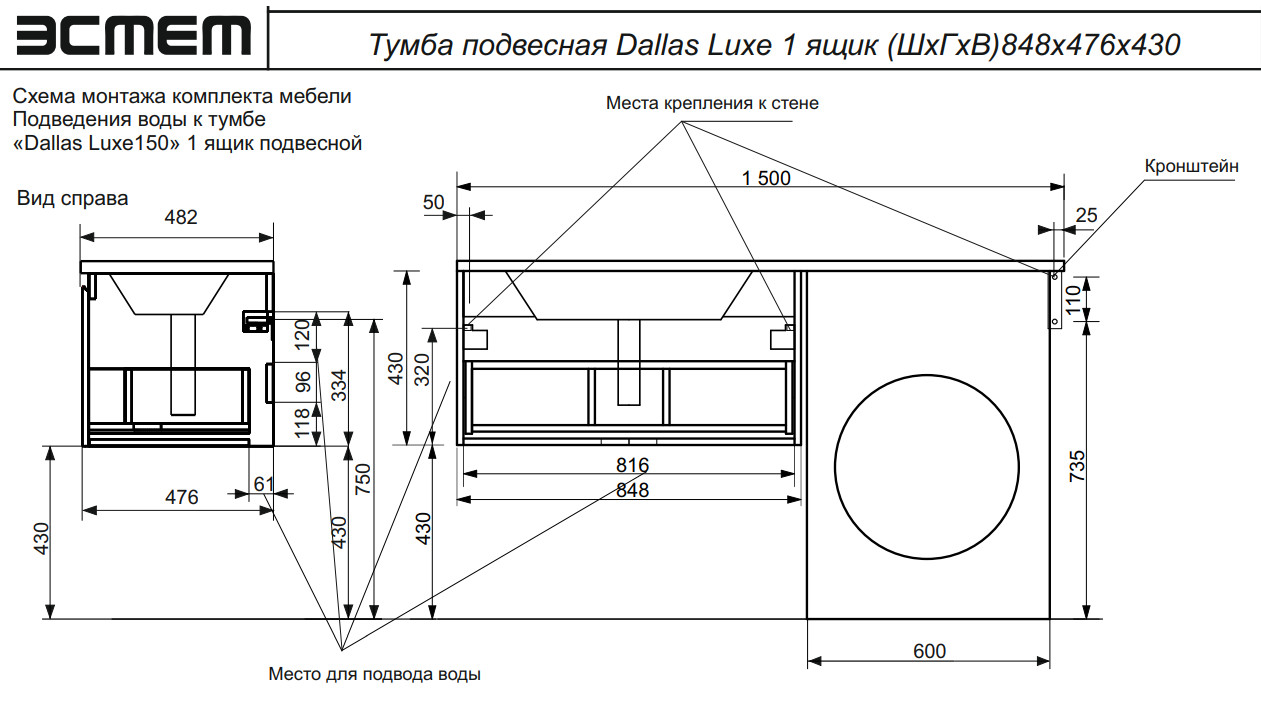 Тумба с раковиной Dallas Luxe 1500 навесная 1 ящик левая