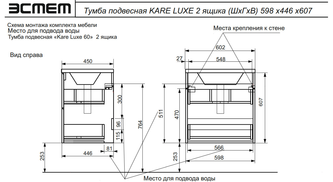 - Тумба с раковиной Kare Luxe 600 навесная 2 ящика
