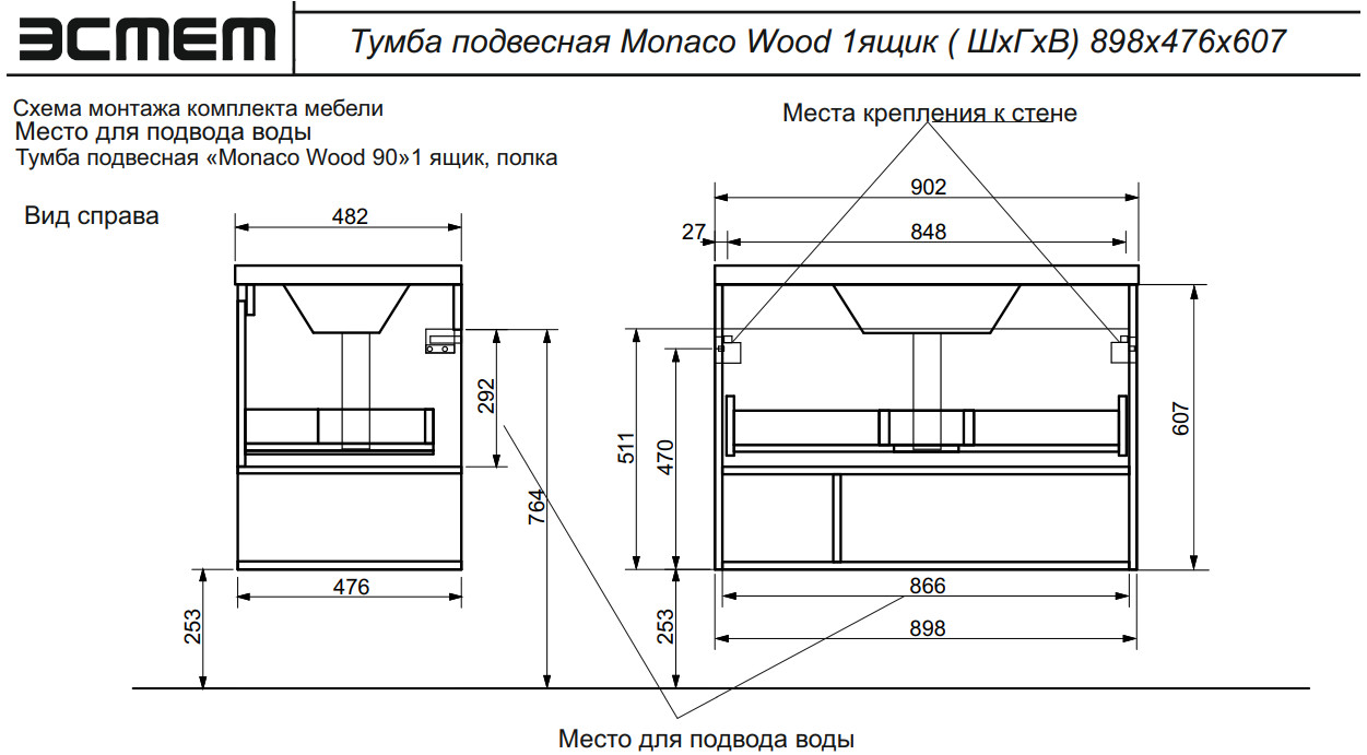 - Тумба с раковиной Monaco Wood 900 1 ящик с нишей
