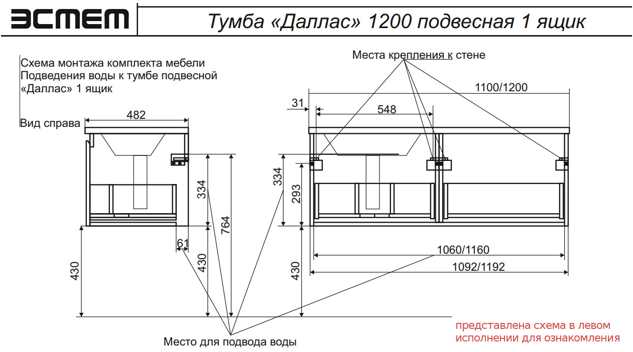 - Тумба с раковиной справа Dallas Luxe 1200 навесная 1 длинный ящик