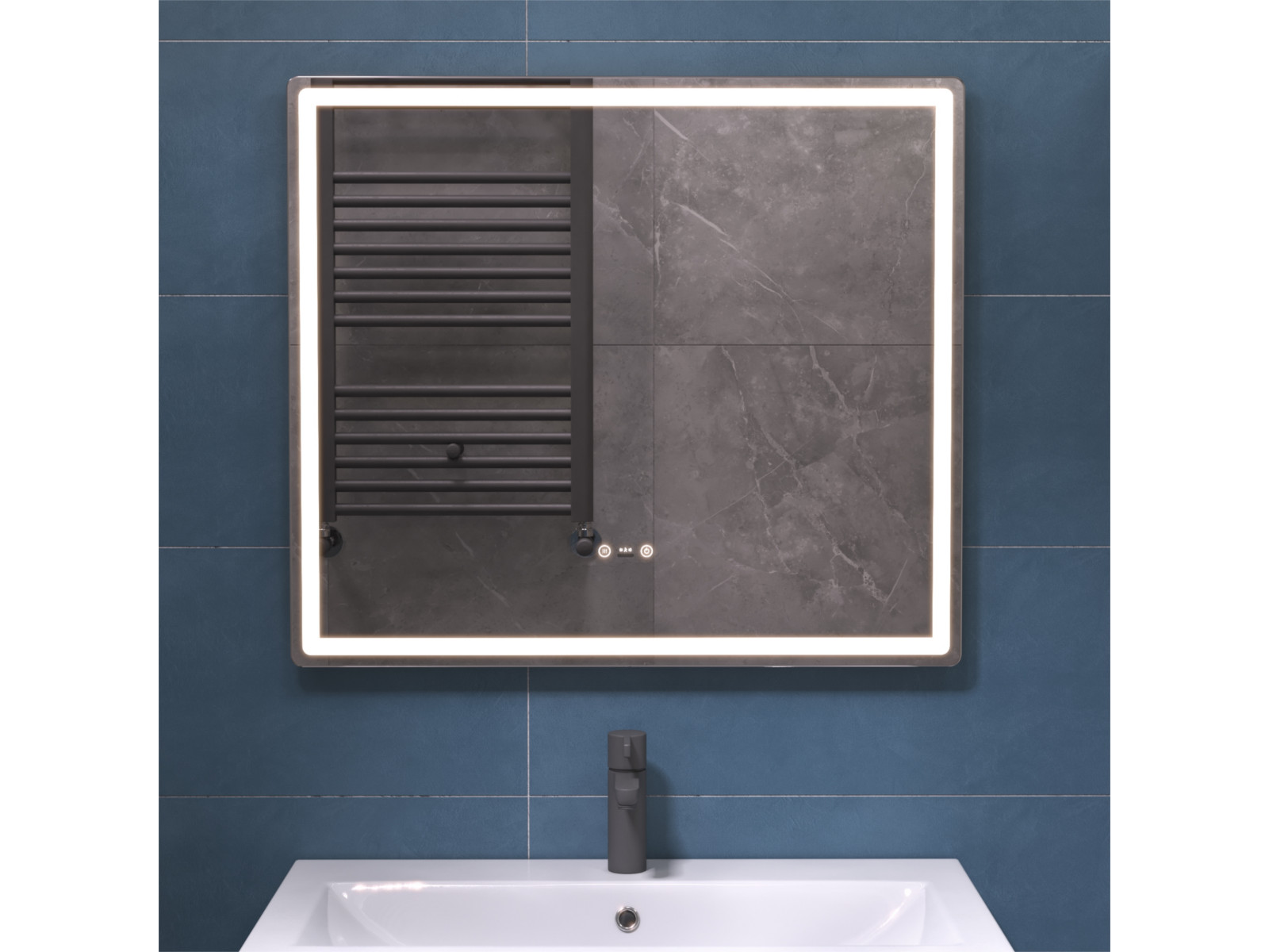 Подсветка фронтальная по периметру, с цветовой температурой 5000К – нейтральный белый, управление подсветкой сенсорное/датчик присутствия (1.5 м.)