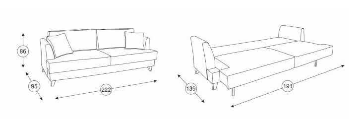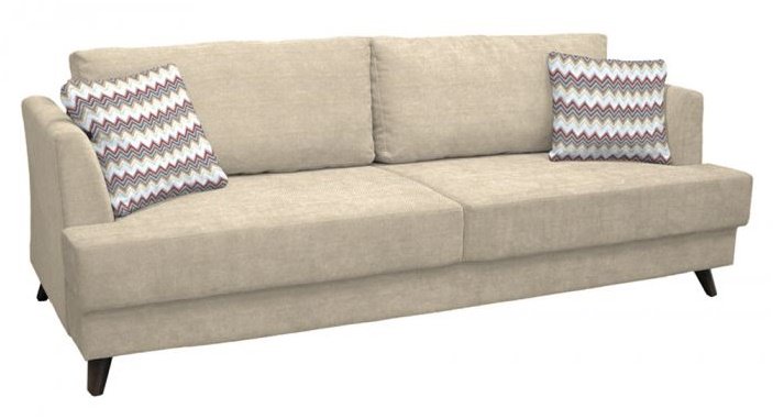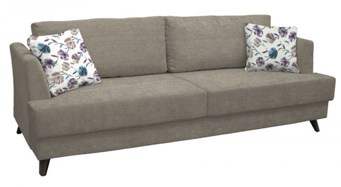 Характеристика: Каркас дивана выполнен из ЛДСП, фанеры, хвойного и березового бруса. Элементы сиденья и спальная часть из ППУ. Наполнитель подушек – полиэфирное волокно и крошка ППУ. Опоры - пластик.