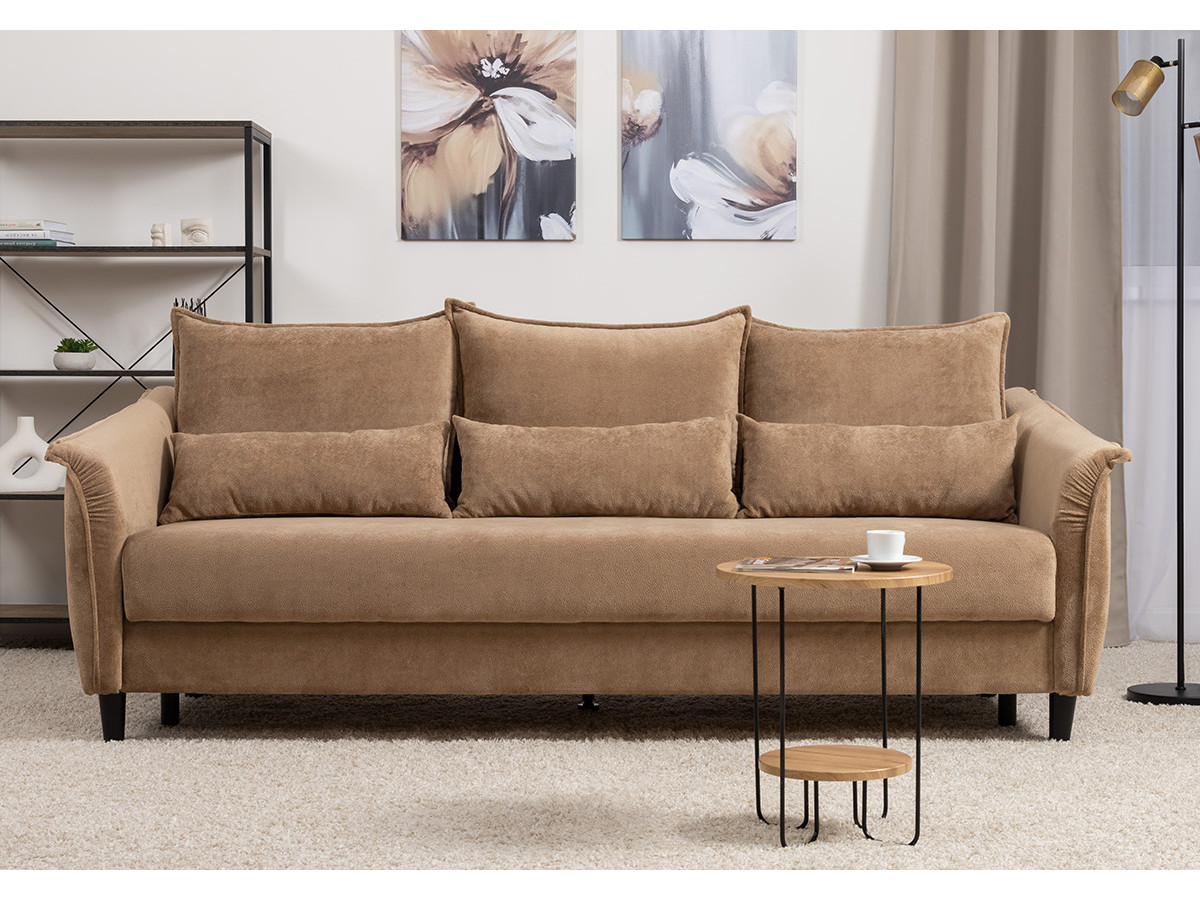 Спинка с тремя приспинными подушками. Две подушки трапецивидной формы, центральная квадратной формы на молнии, по трем сторонам которых проложена отделочная строчка на 1,2 см. По контуру боковин проложен декоративный кант на 1,2 см из основной ткани. Кант проходит по центру передней части боковины, а по внутренней верхней части сборка.