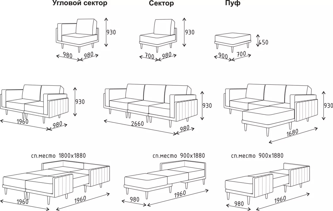 - Модули УС+УС+С+Пуф спальное место 1800х1880х450 мм