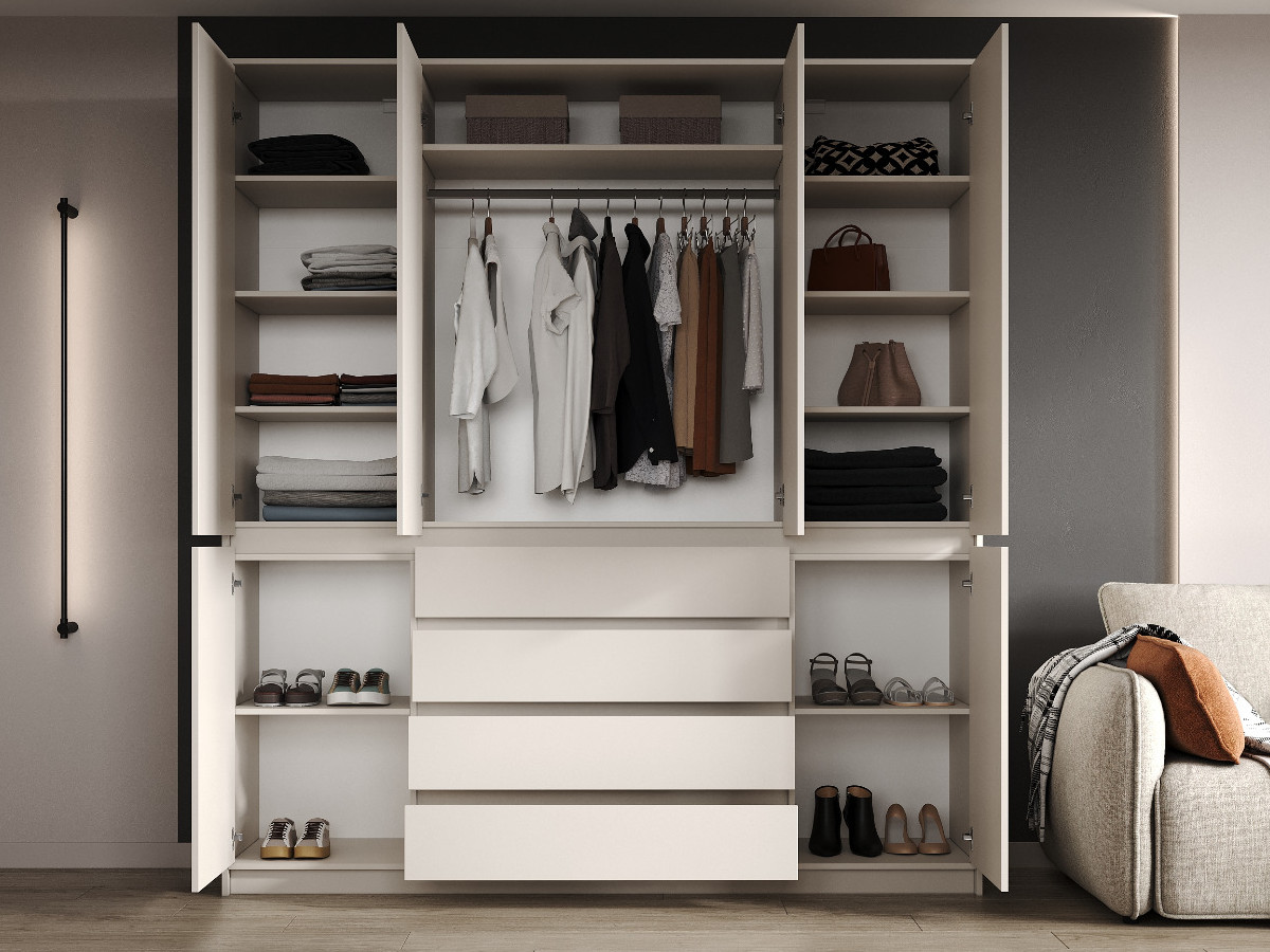 - Для открывания створок предусмотрен зазор 30мм, который скрыт изнутри планкой ЛДСП в цвет корпуса. Расстояние от пола до верха нижних створок 961мм, от пола до нижней части верхних створок 991мм.