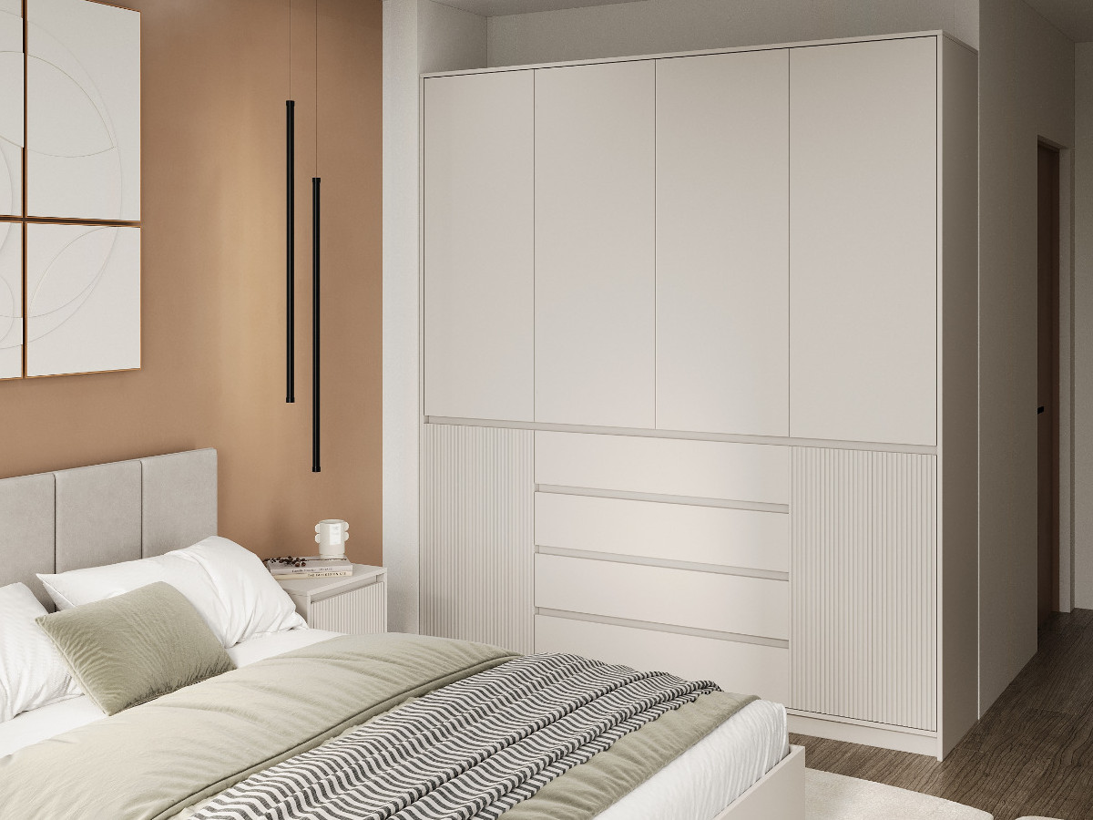 - Верхняя часть шкафа закрывается створками ЛДСП в цвет корпуса, нижняя фасадами МДФ с фрезеровкой. Створки, которые устанавливаются на перегородки, комплектуются полунакладными петлями. На боковины створки крепятся внутренними петлями.