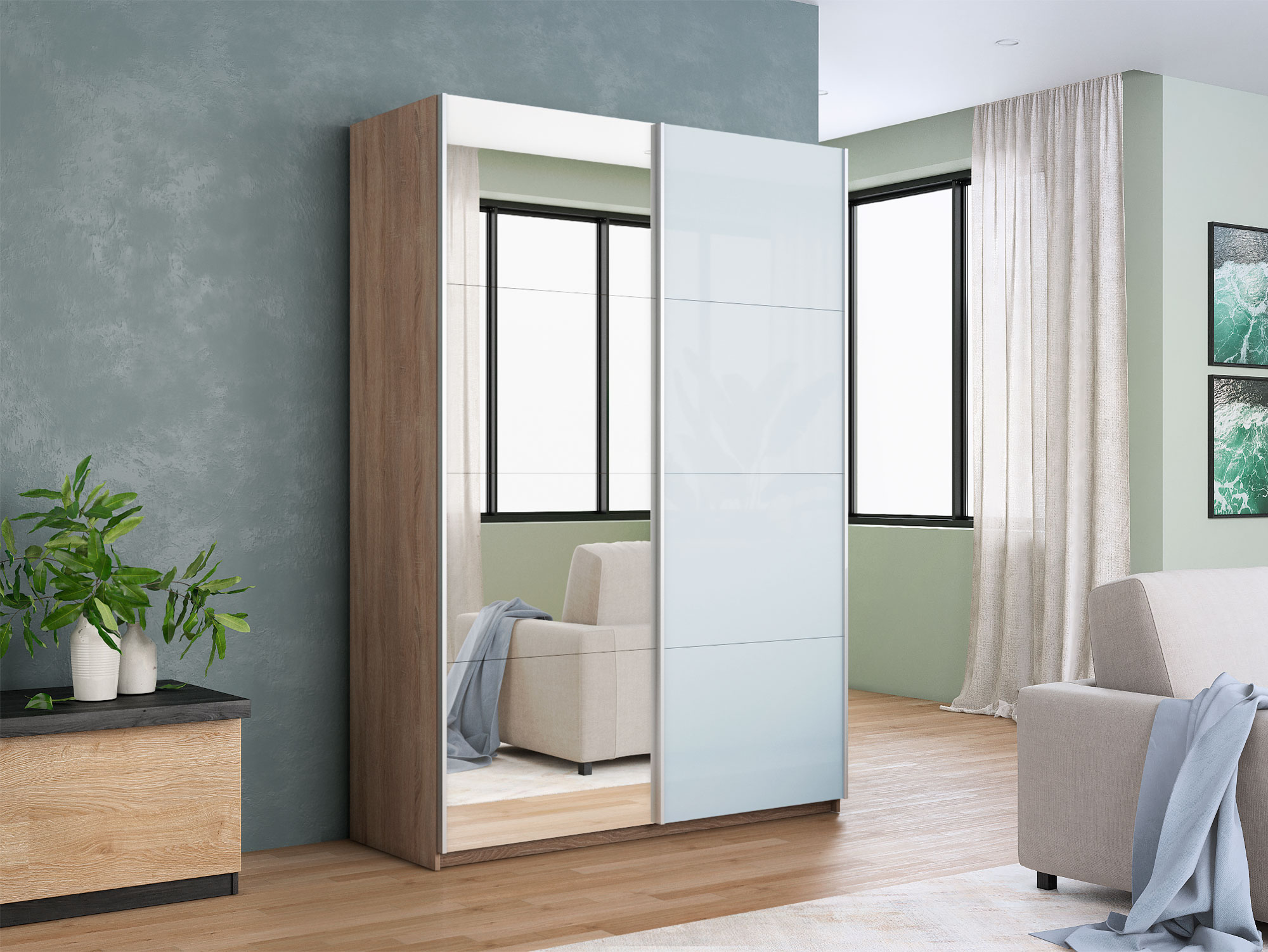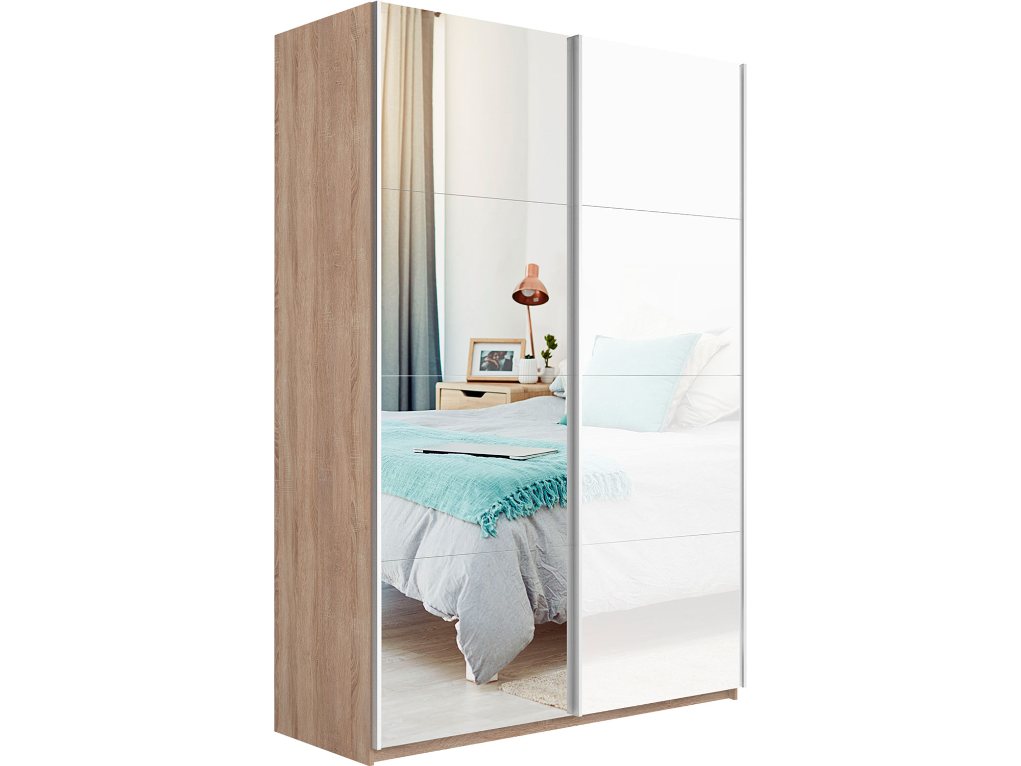 - Шкаф-купе Прайм 2-х дверный 1200 Зеркало/Стекло Белое Сонома