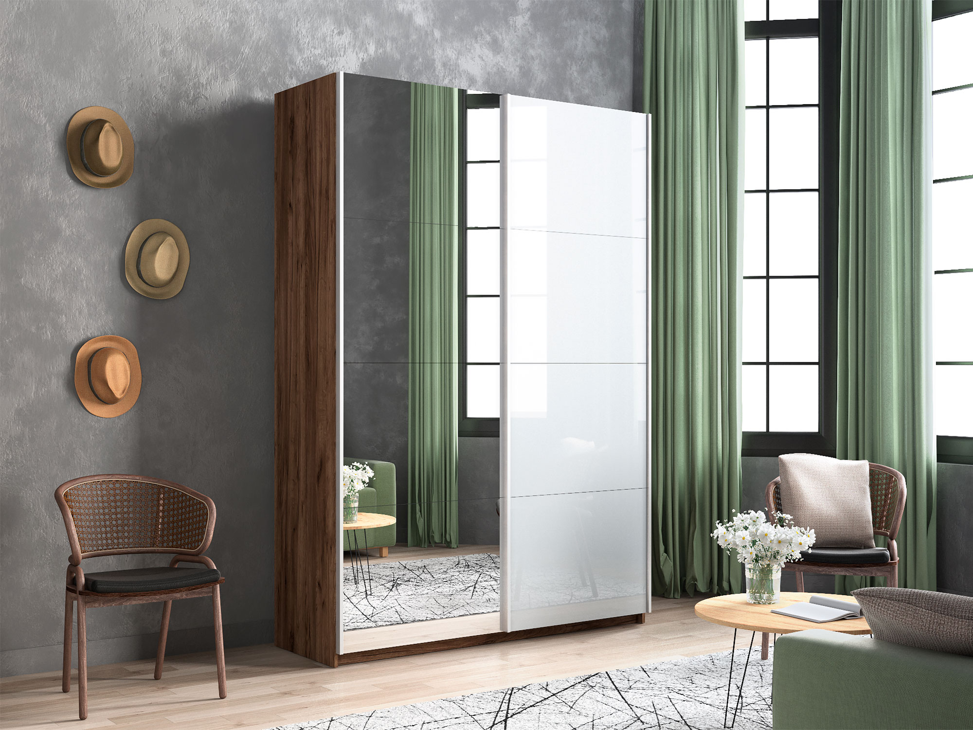 - Шкаф-купе Прайм 2-х дверный 1400 Зеркало/Стекло Белое Крафт табачный