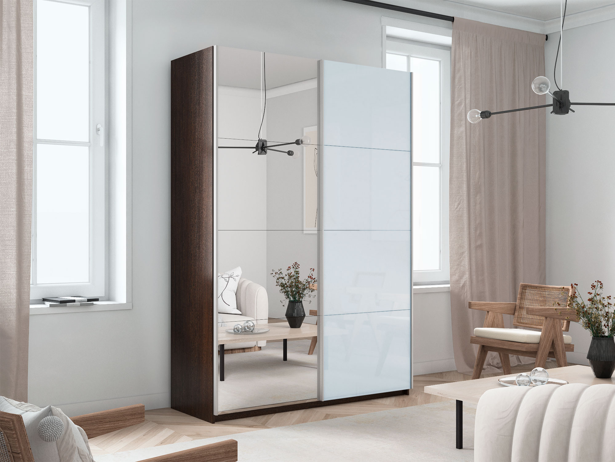- Шкаф-купе Прайм 2-х дверный 1400 Зеркало/Стекло Белое Венге