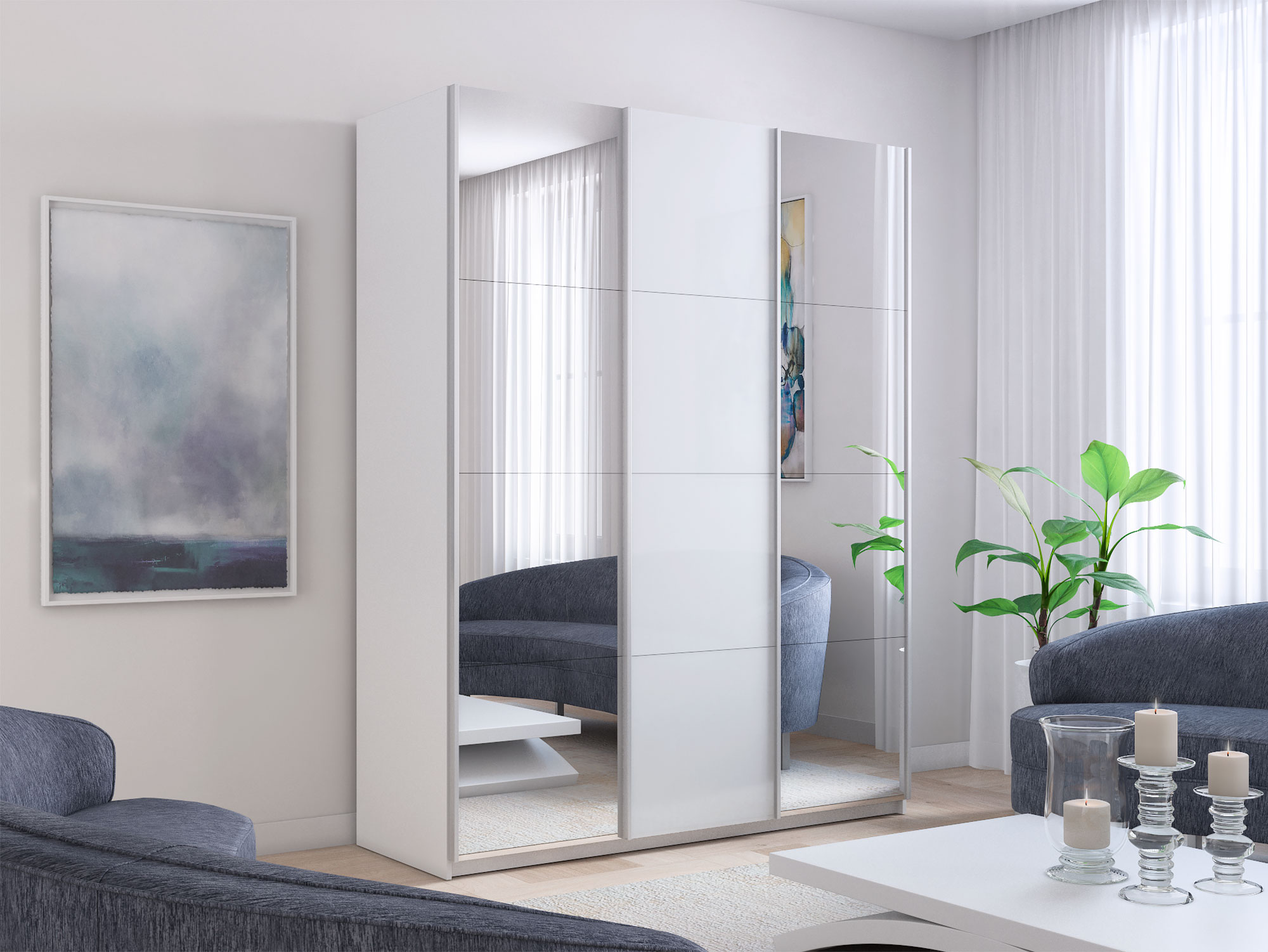 Шкаф-купе Прайм 3-х дверный 1800 Зеркало/Стекло Белое/Зеркало Белый Снег