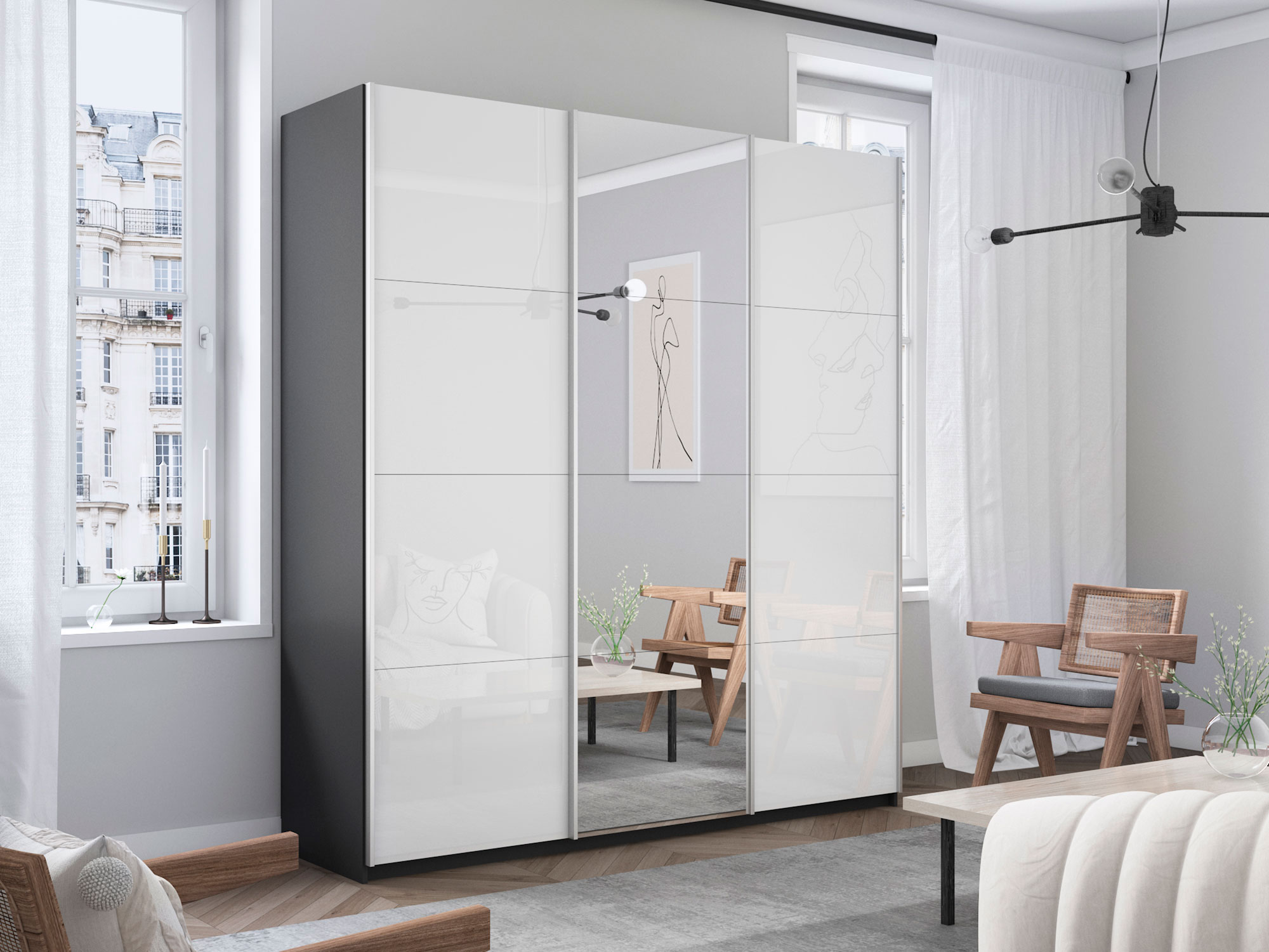 - Шкаф-купе Прайм Широкий 3-х дверный два белых стекла/зеркало Серый Диамант