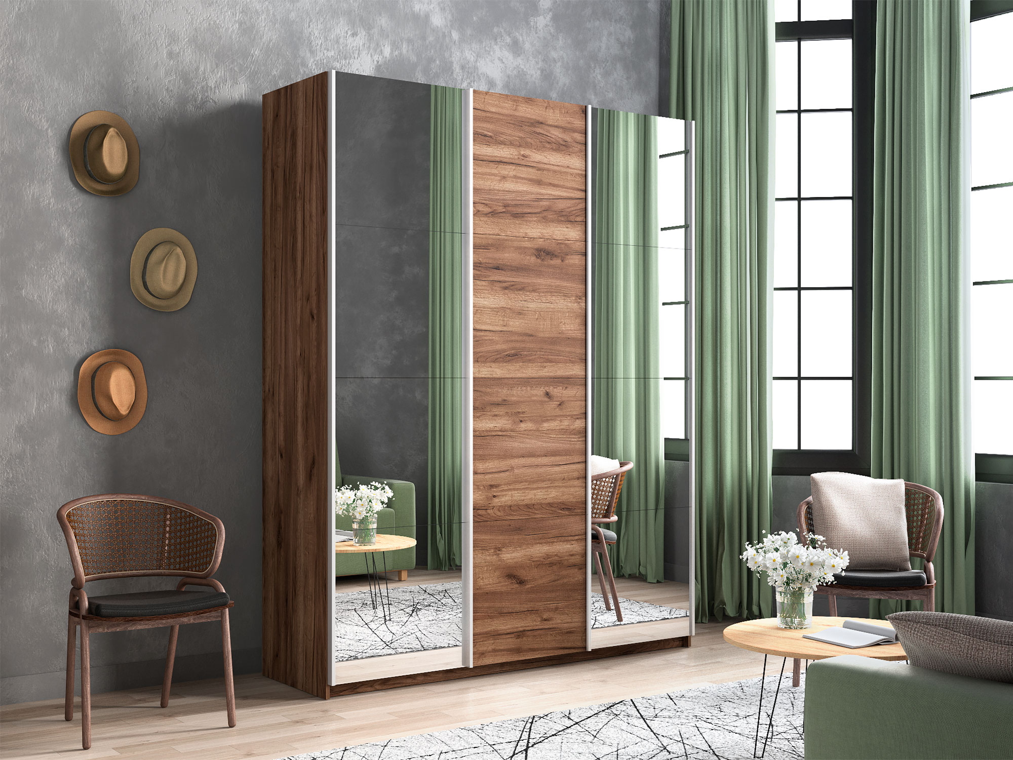 - Шкаф-купе Прайм Широкий 3-х дверный два зеркала/ДСП Крафт табачный